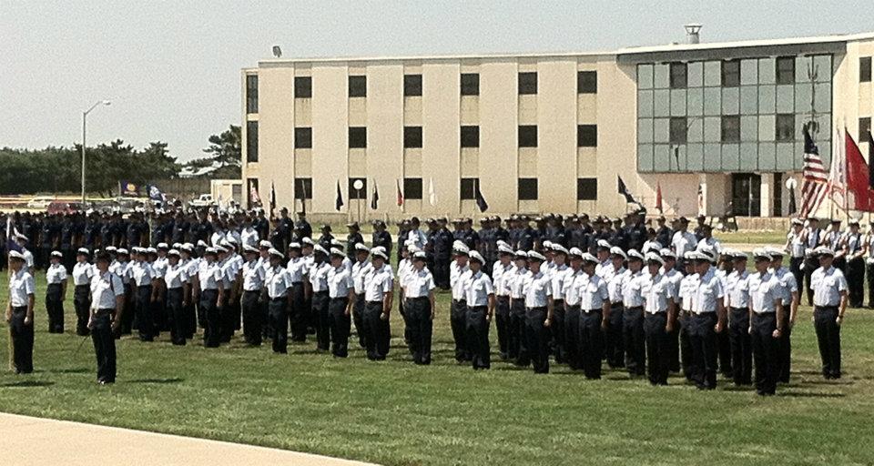 The graduation of Uniform Company-186 was celebratory and jubilant, marked with a strong performance by the all-recruit volunteer band. Families and friends were treated with an orange Coast Guard Helicopter fly-by (I’m sure my husband could tell you the exact make and model) and a rousing parade of the graduating company in their spiffy white covers (hats to us civilians) and tropical blue uniforms. Younger recruit companies in ODUs (Operational Dress Uniforms) marched by so we could cheer them on. And the confused/terrorized/fill in the blank looks on some of these young faces indicated a strong need for encouragement—especially those who were only in week 2 of boot camp.
