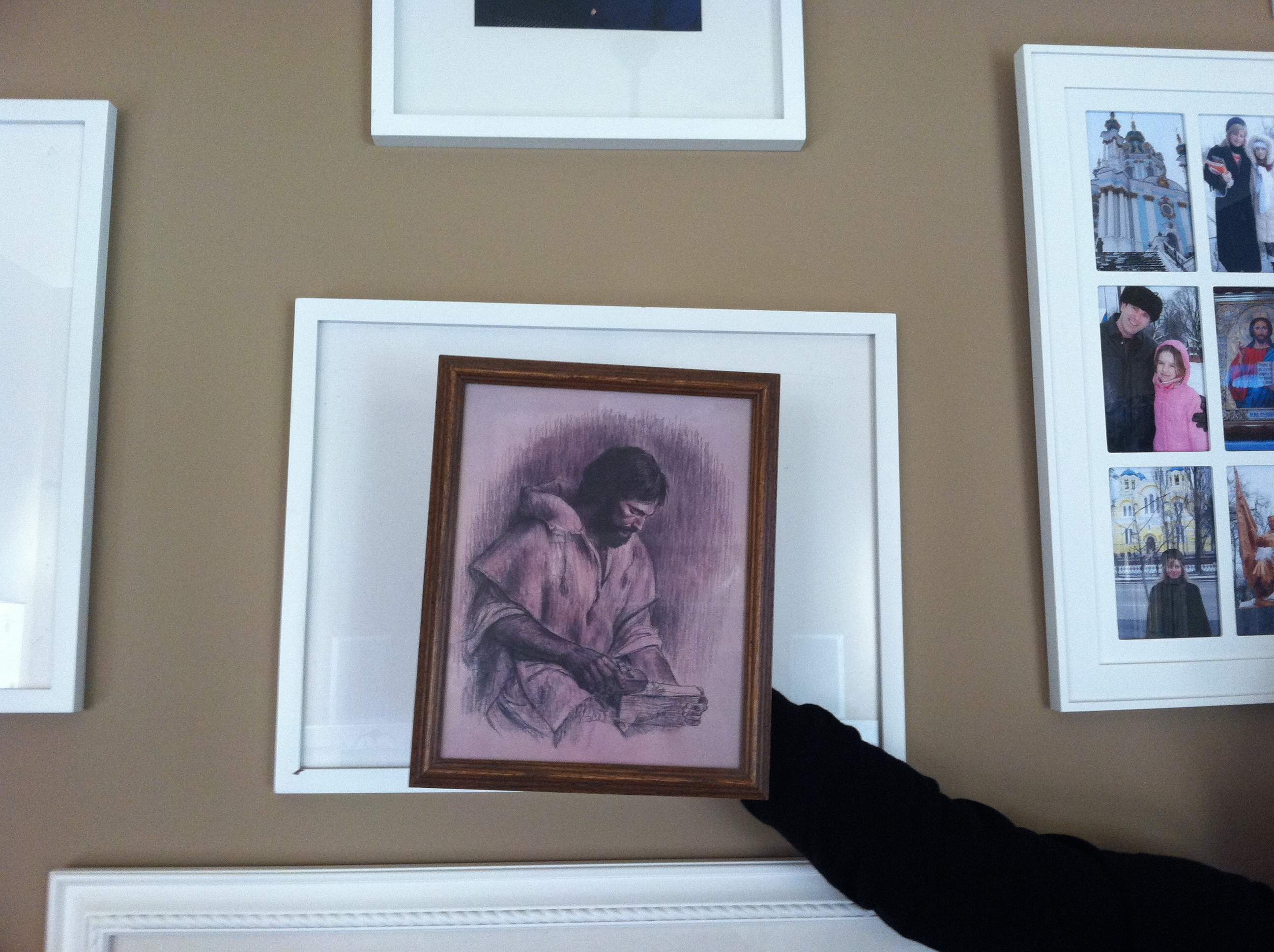 After putting the Christmas stuff away, I found a drawing someone had left in the TV room. It came from Tim’s house and used to be in his boys room. It’s a sketch of Jesus as a carpenter. I thought of putting this drawing at the center of our family wall as a reminder to keep the Carpenter, whose birthday decorations Ethan and I just took down, at the center of our lives and our family.
